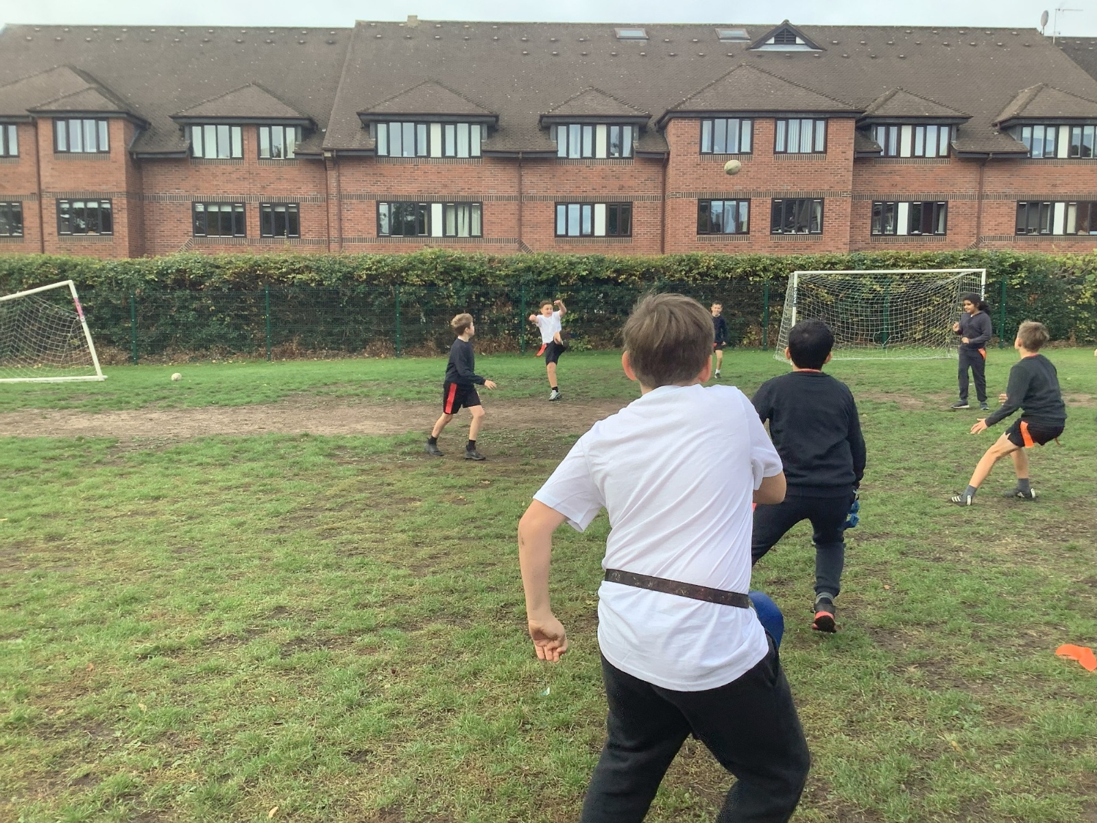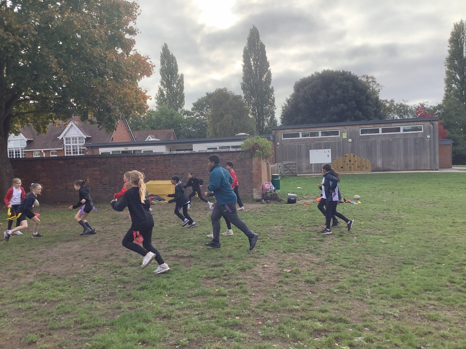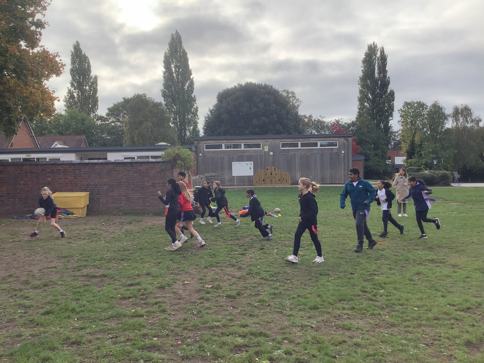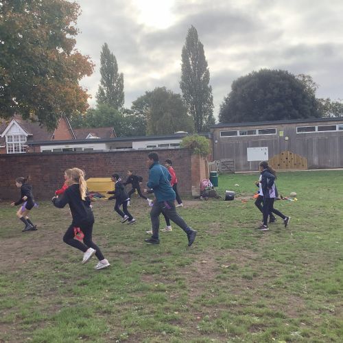 We are currently learning to play Tag Rugby, and it’s been really fun! If a player pulls your tag while you’re running with the ball, you have to hand the ball over to the other team so they can start their turn.