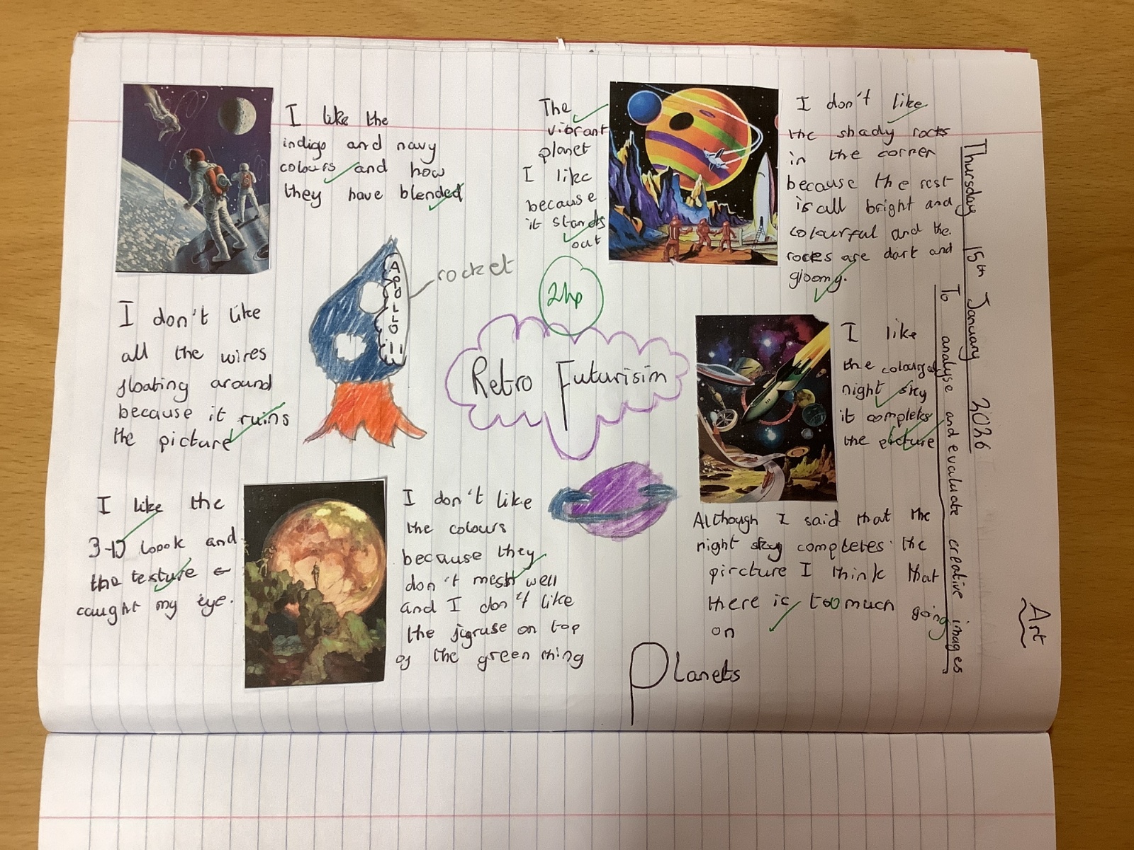 Finally, in Art, Year 5 started their new retro-futurism space art. We looked at different space-themed images and became art critics, explaining what we liked and disliked and why. We used artistic vocabulary to share our opinions and listened carefully to each other’s ideas.