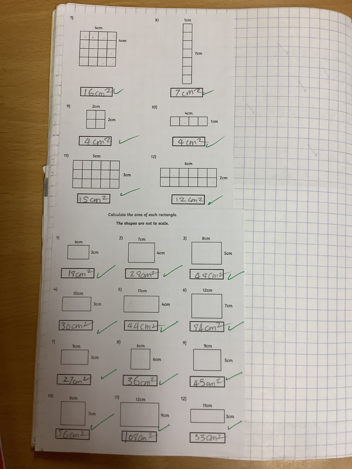 Next, we have been completing and consolidating our learning on perimeter and area in Maths. We practised finding the perimeter by adding all the sides of shapes and worked out the area by counting squares and using multiplication. Year 5 showed great perseverance and are becoming much more confident with these skills.