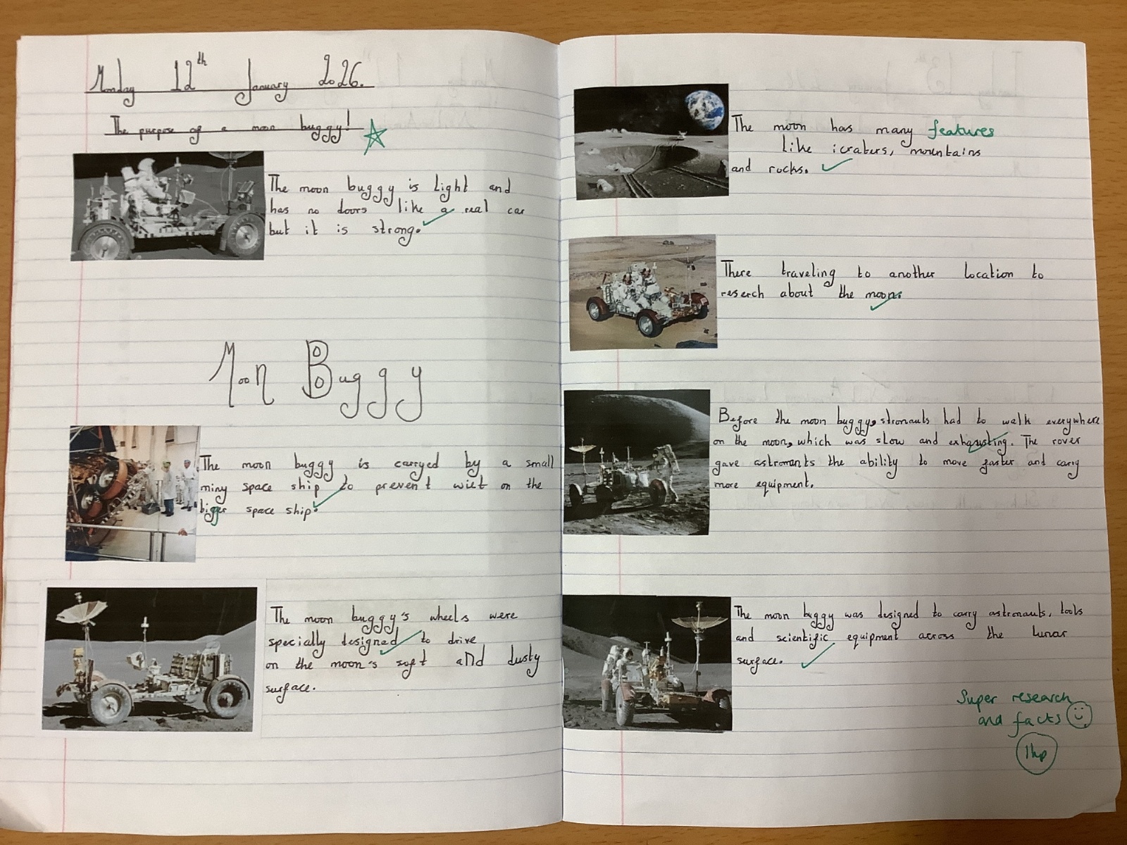 For Design and Technology, Year 5 researched the moon buggy and learnt about its purpose. We found out why it was designed, how it worked on the Moon and how it helped astronauts explore the lunar surface more easily.