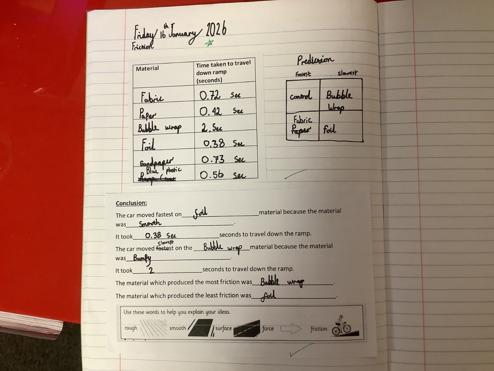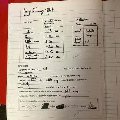 We have also enjoyed our learning about forces this week. Testing which materials create the most friction and working together to record the results. The children enjoyed carrying out the experiment.