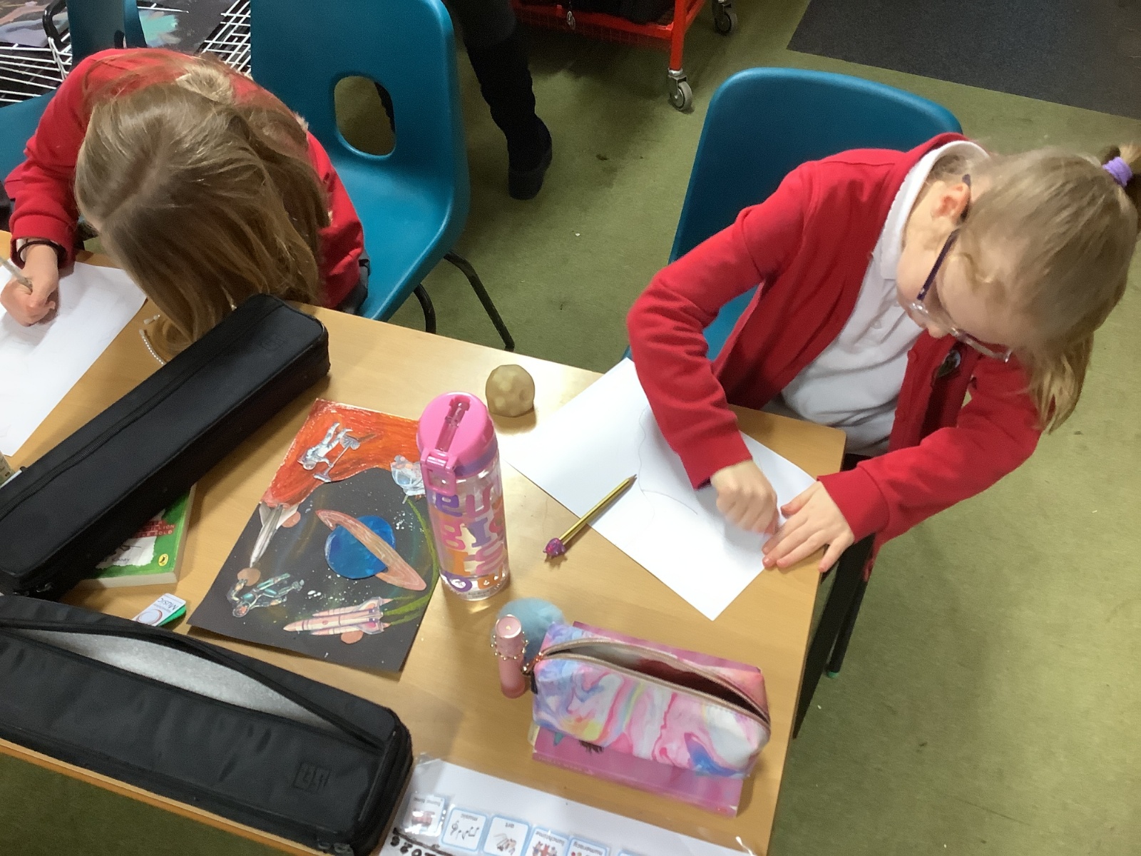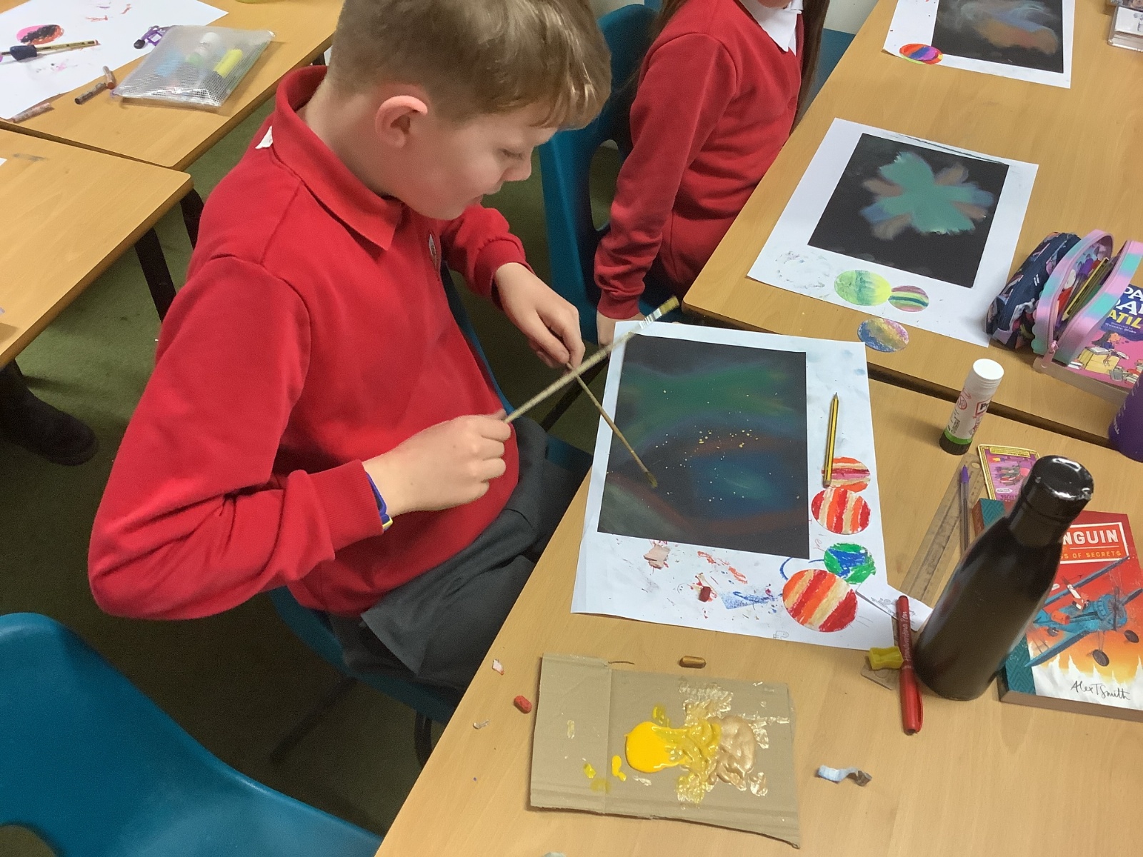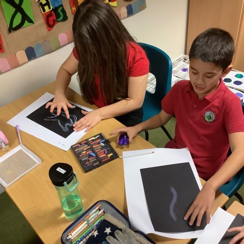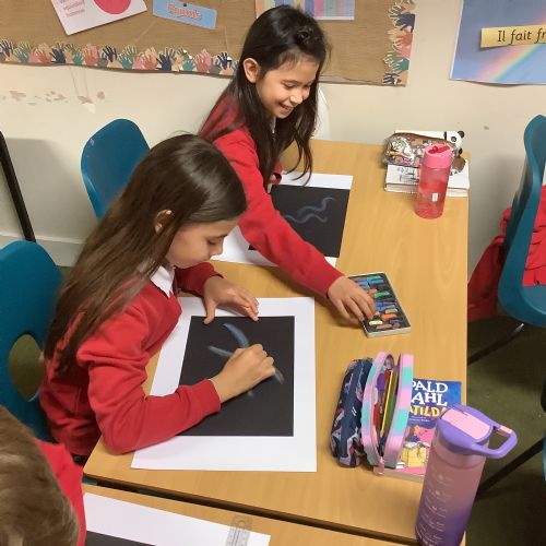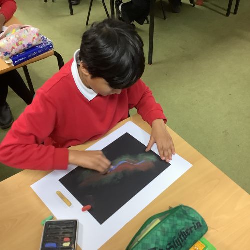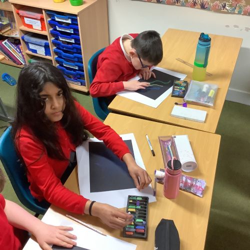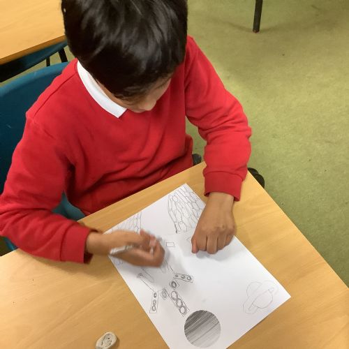 In Art, the children continued with their space-themed topic, experimenting with a range of exciting techniques. They used soft pastels to create beautiful nebula effects, paint splatter with paintbrushes to represent stars, and oil pastels to design vibrant planets. The children compared the different media they worked with, including sponges, acrylic paints, and pastels, and thoughtfully explained which they preferred and why. After lots of experimentation and inspiration, they designed a draft for their retrofuturism collage piece, ready for the next stage of the project.