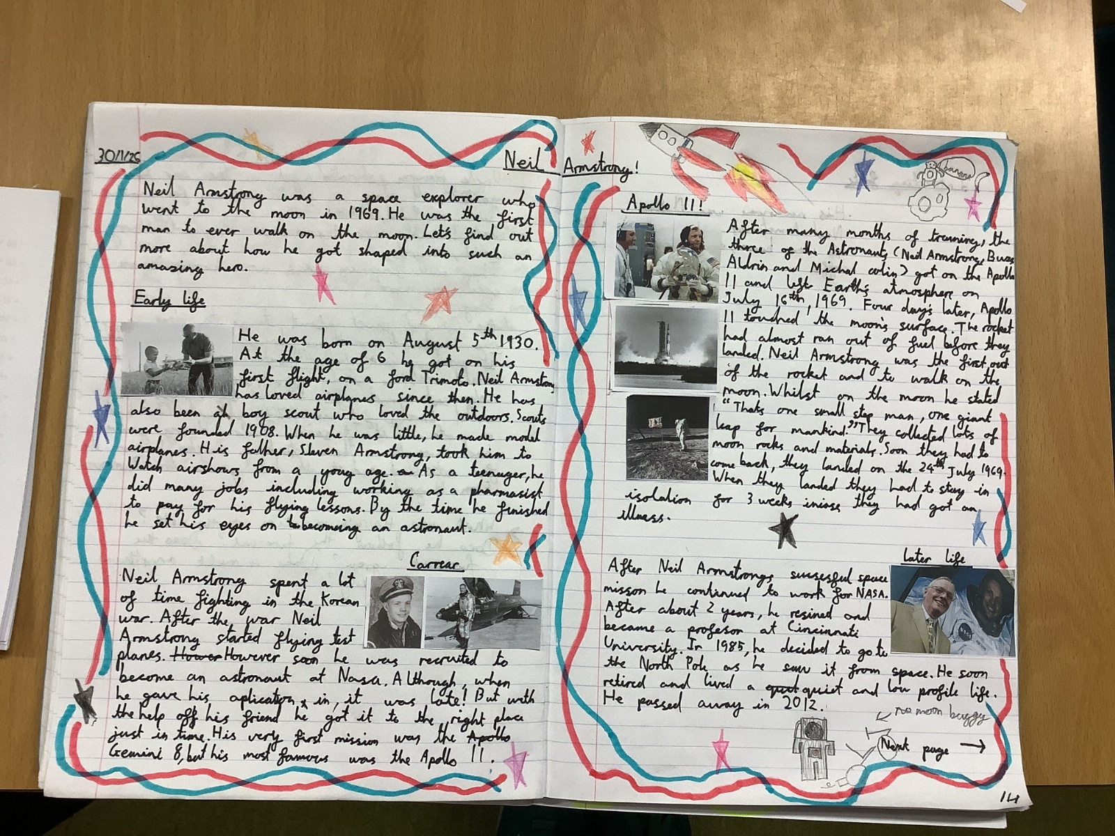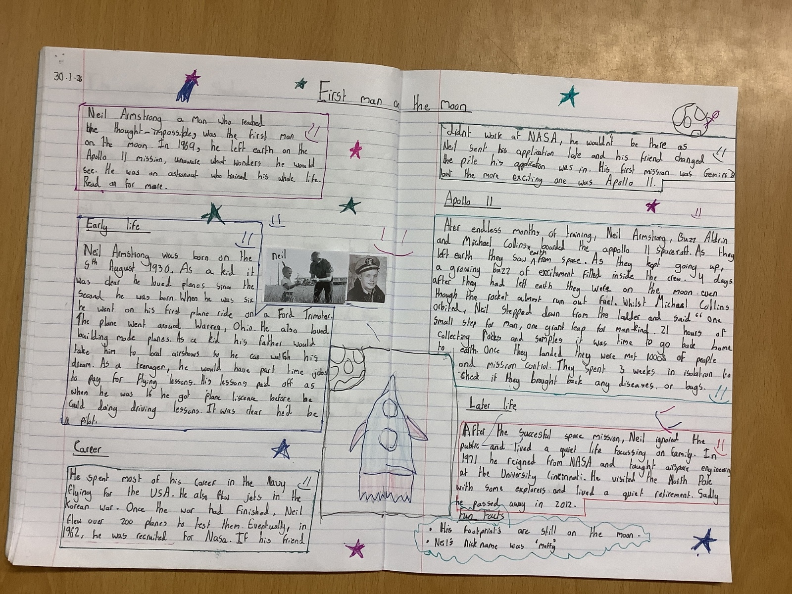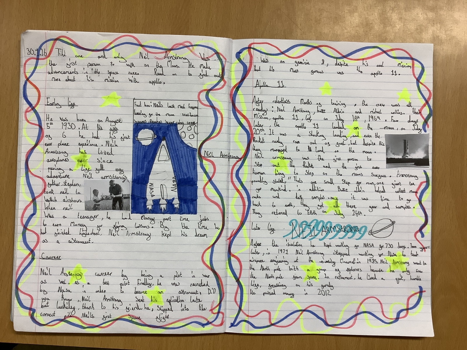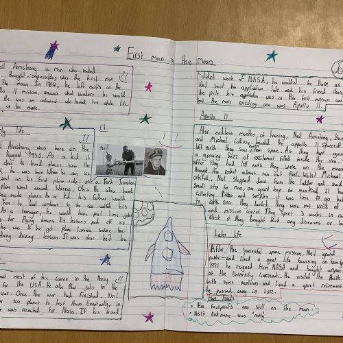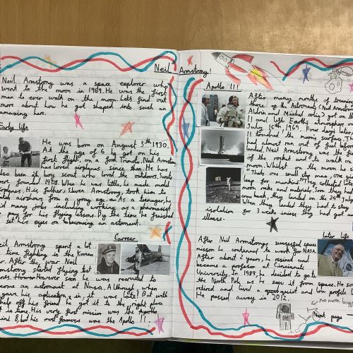 In English, Year 5 proudly published their chronological reports / biographies about Neil Armstrong. These showcased their strong research skills, clear organisation, and improved writing style.