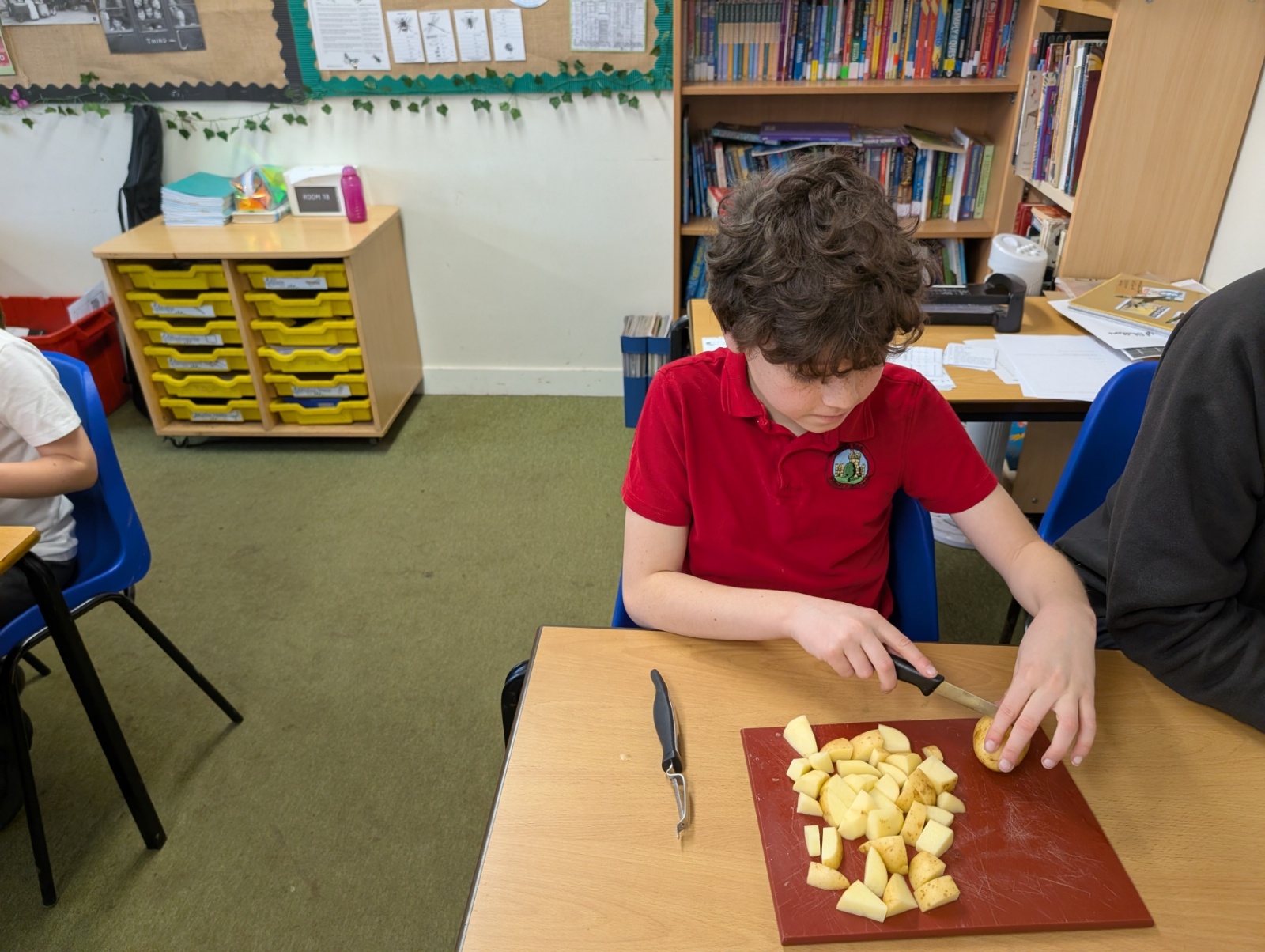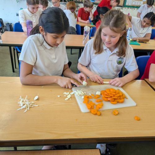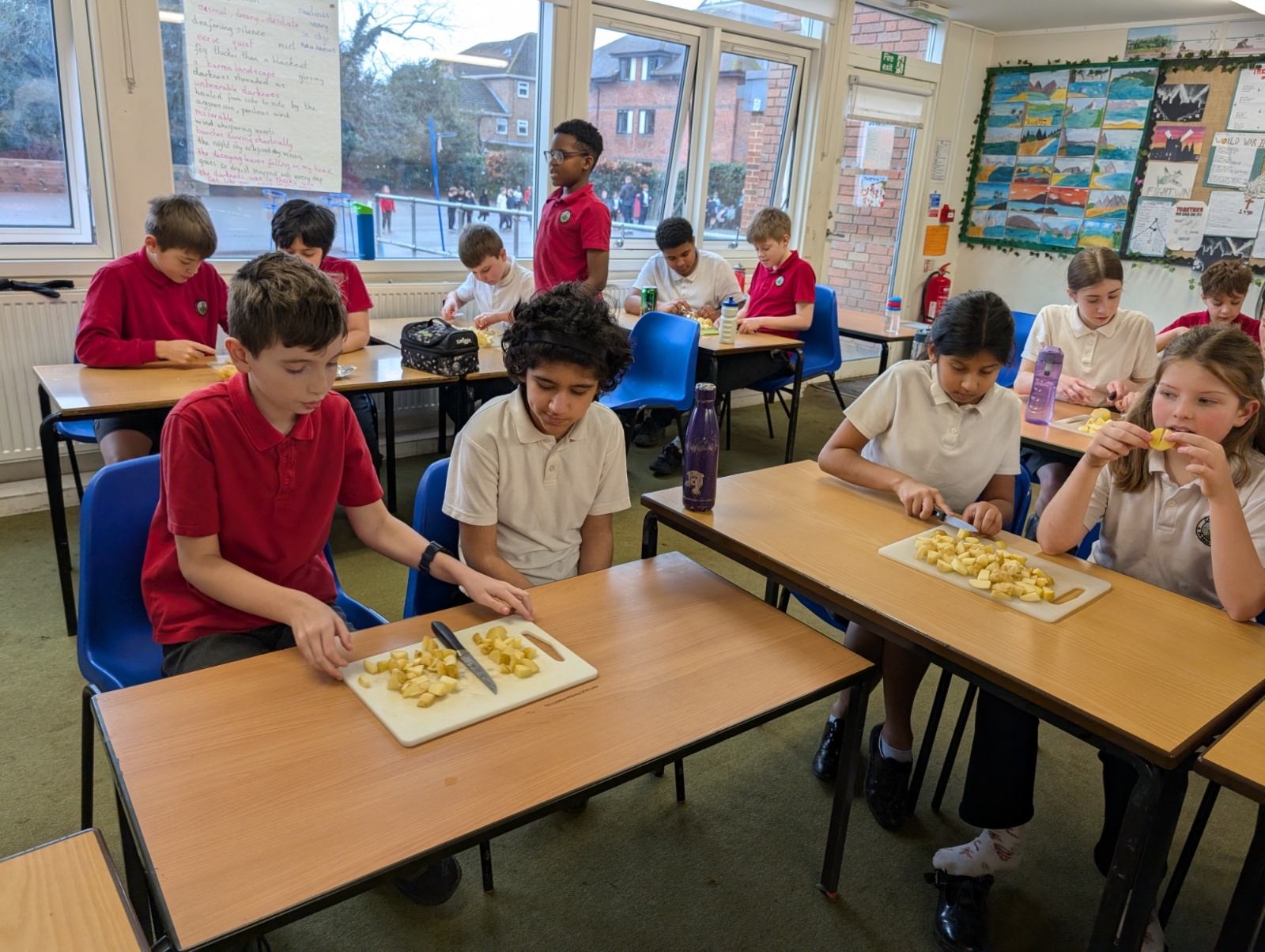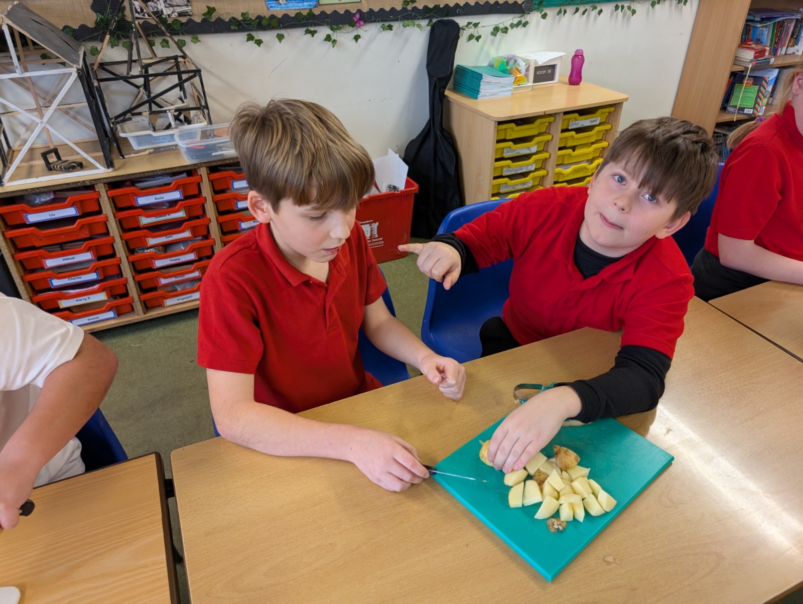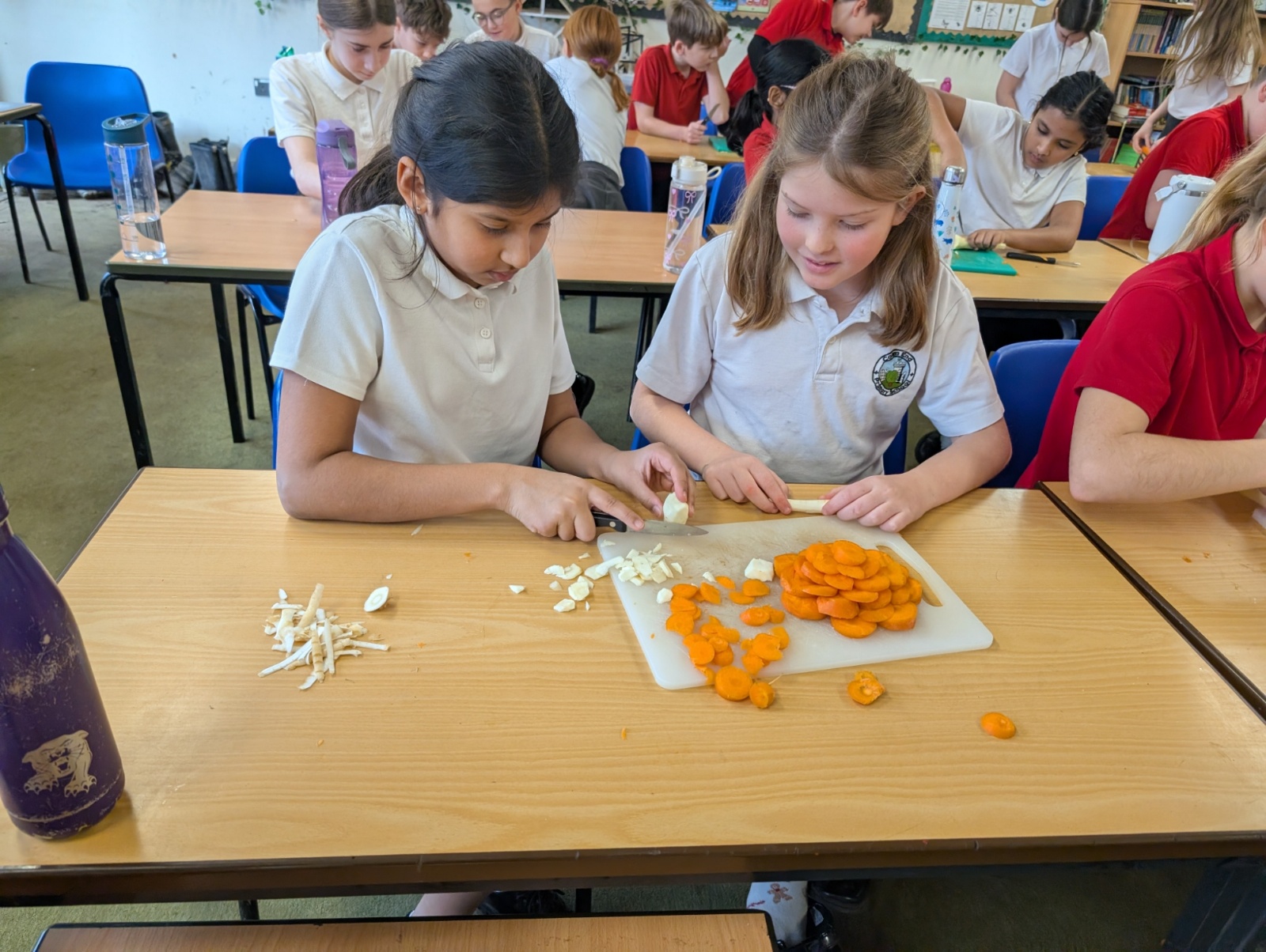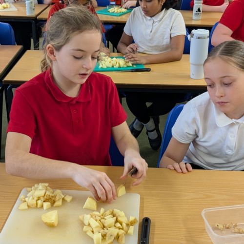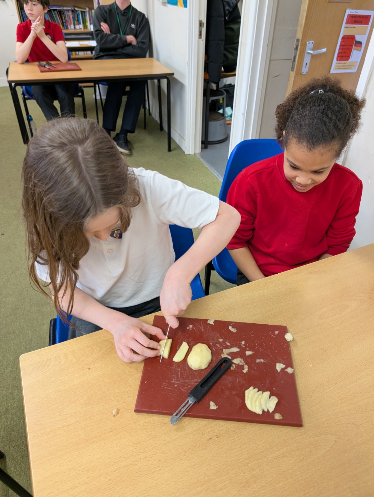 In DT, we practised our chopping skills in preparation for our upcoming World War II Cooking Day. We worked carefully with our partners to keep everyone safe, using the bridge, claw, and cross-chop positions correctly.