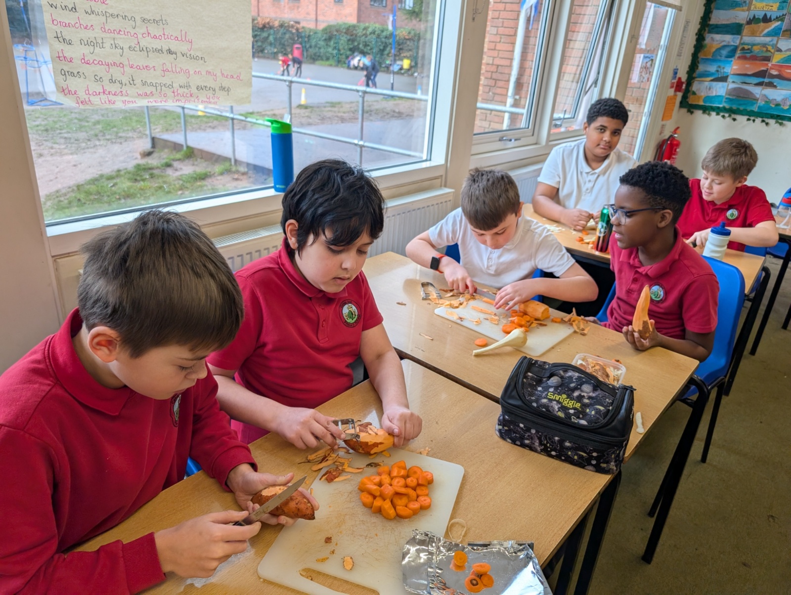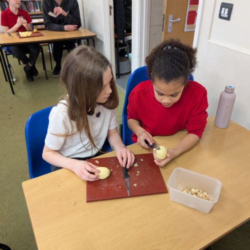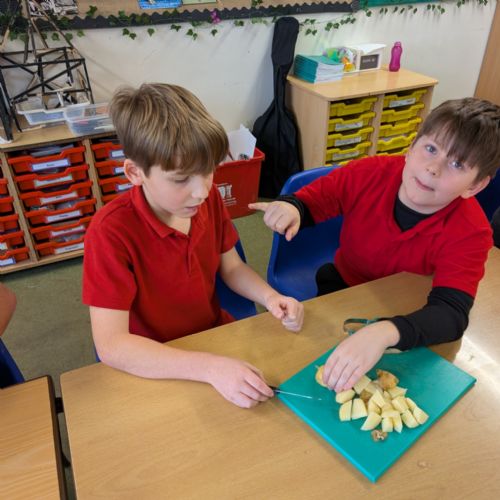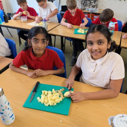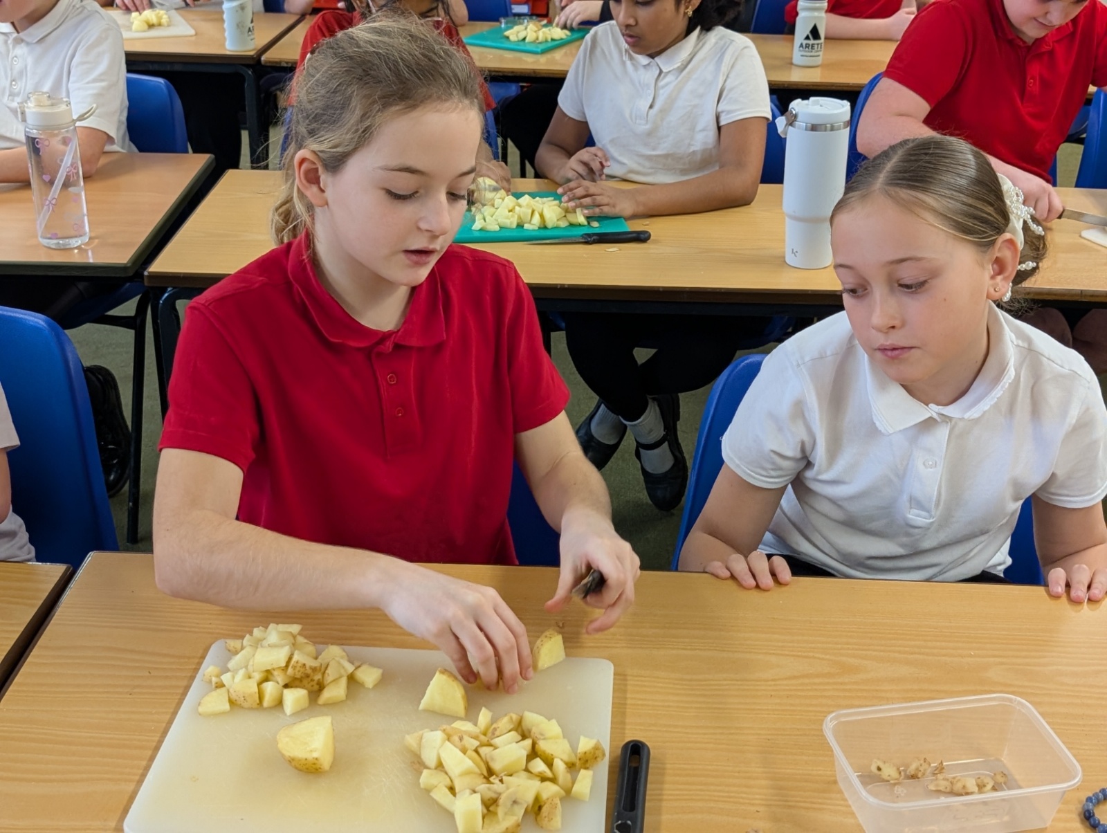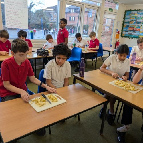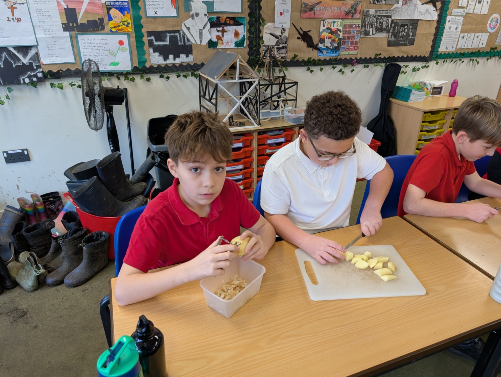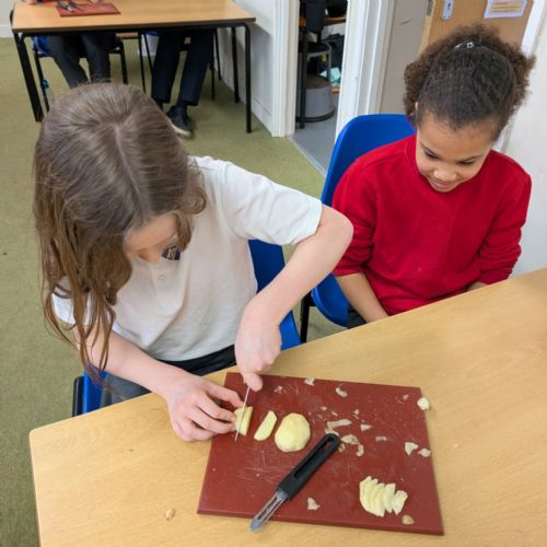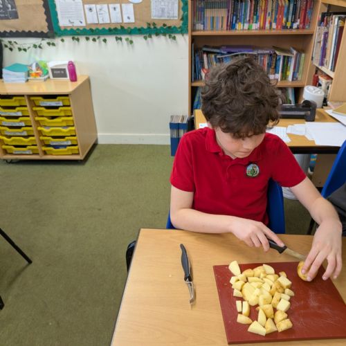 In DT, we practised our chopping skills in preparation for our upcoming World War II Cooking Day. We worked carefully with our partners to keep everyone safe, using the bridge, claw, and cross-chop positions correctly.