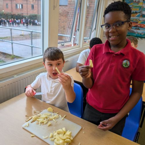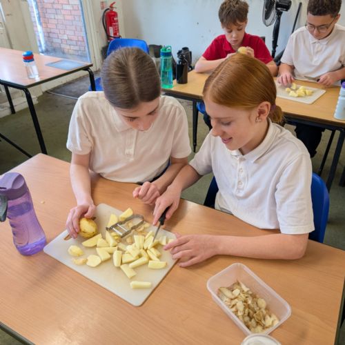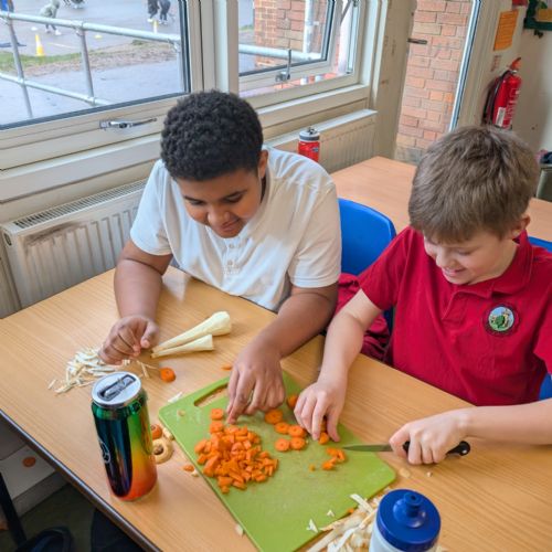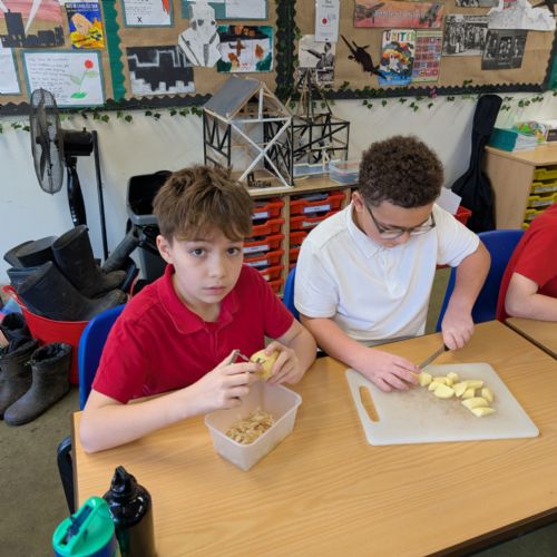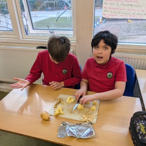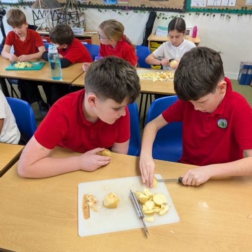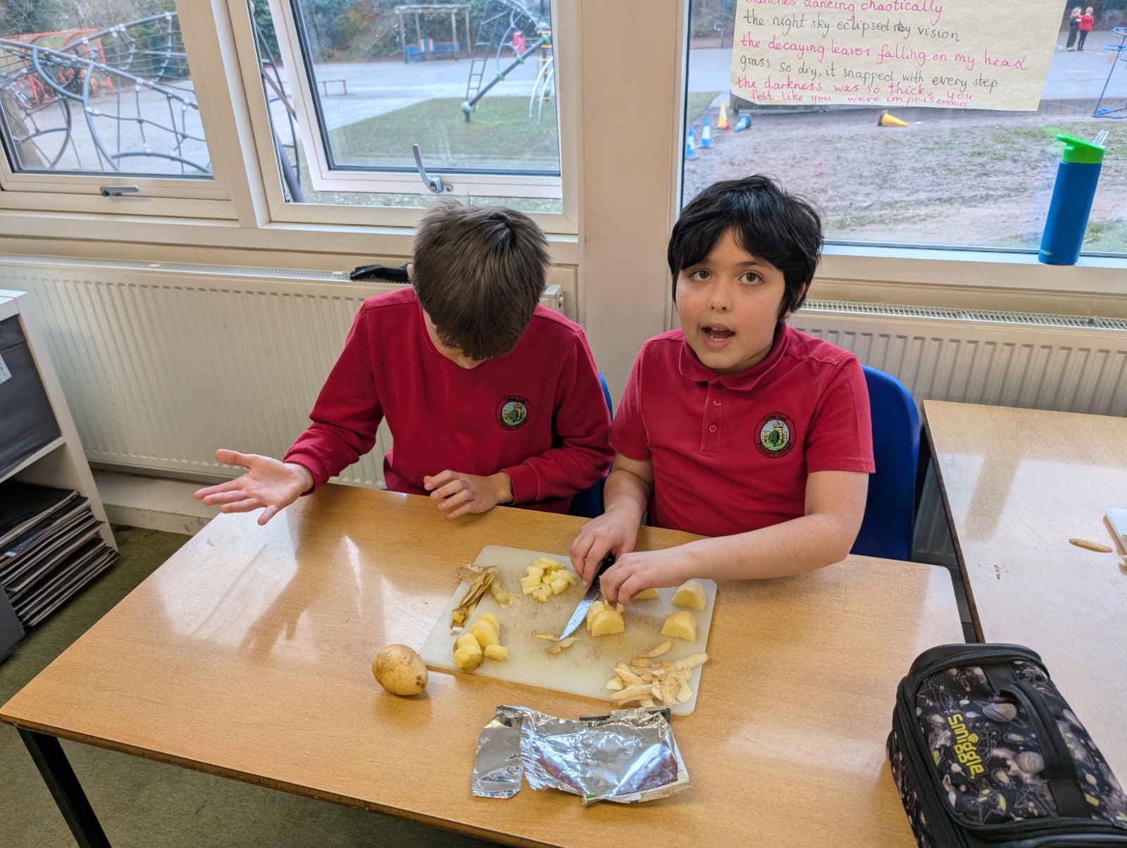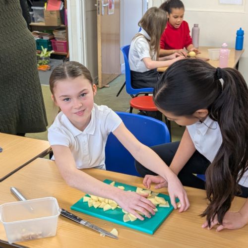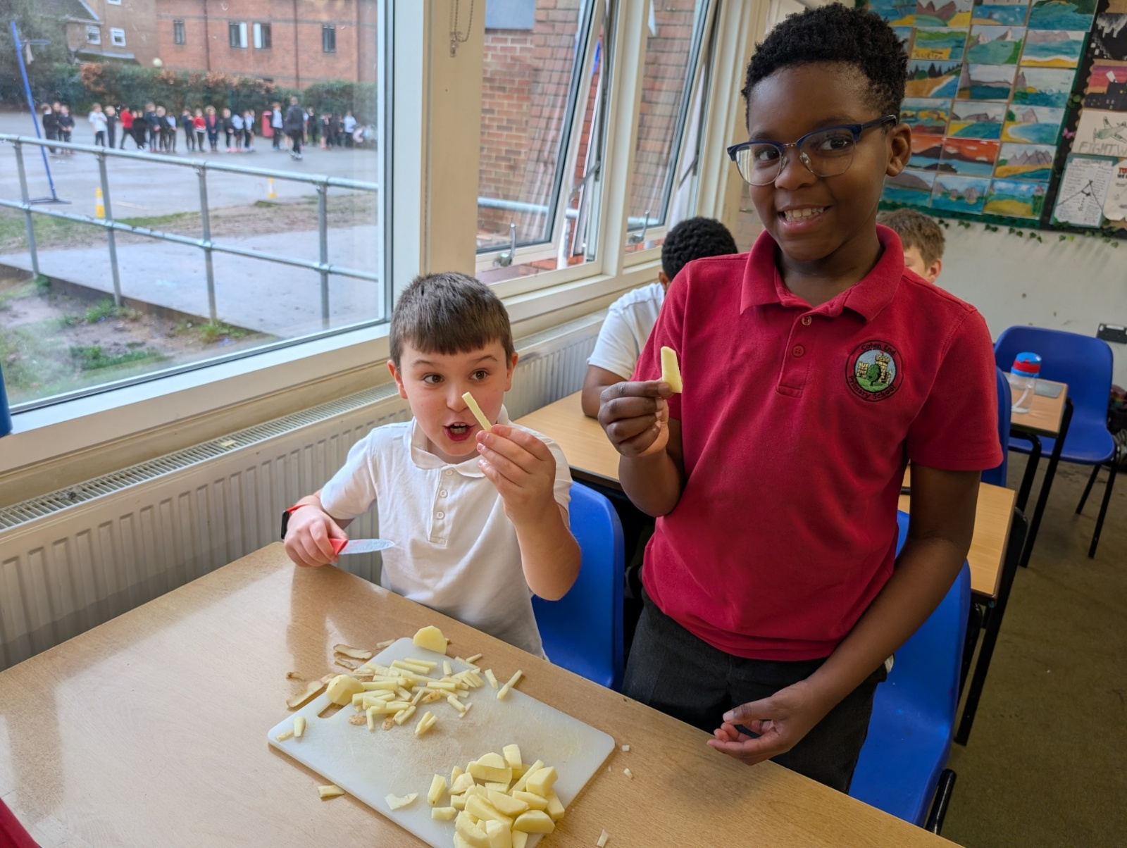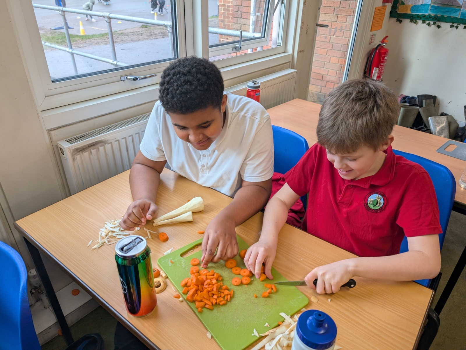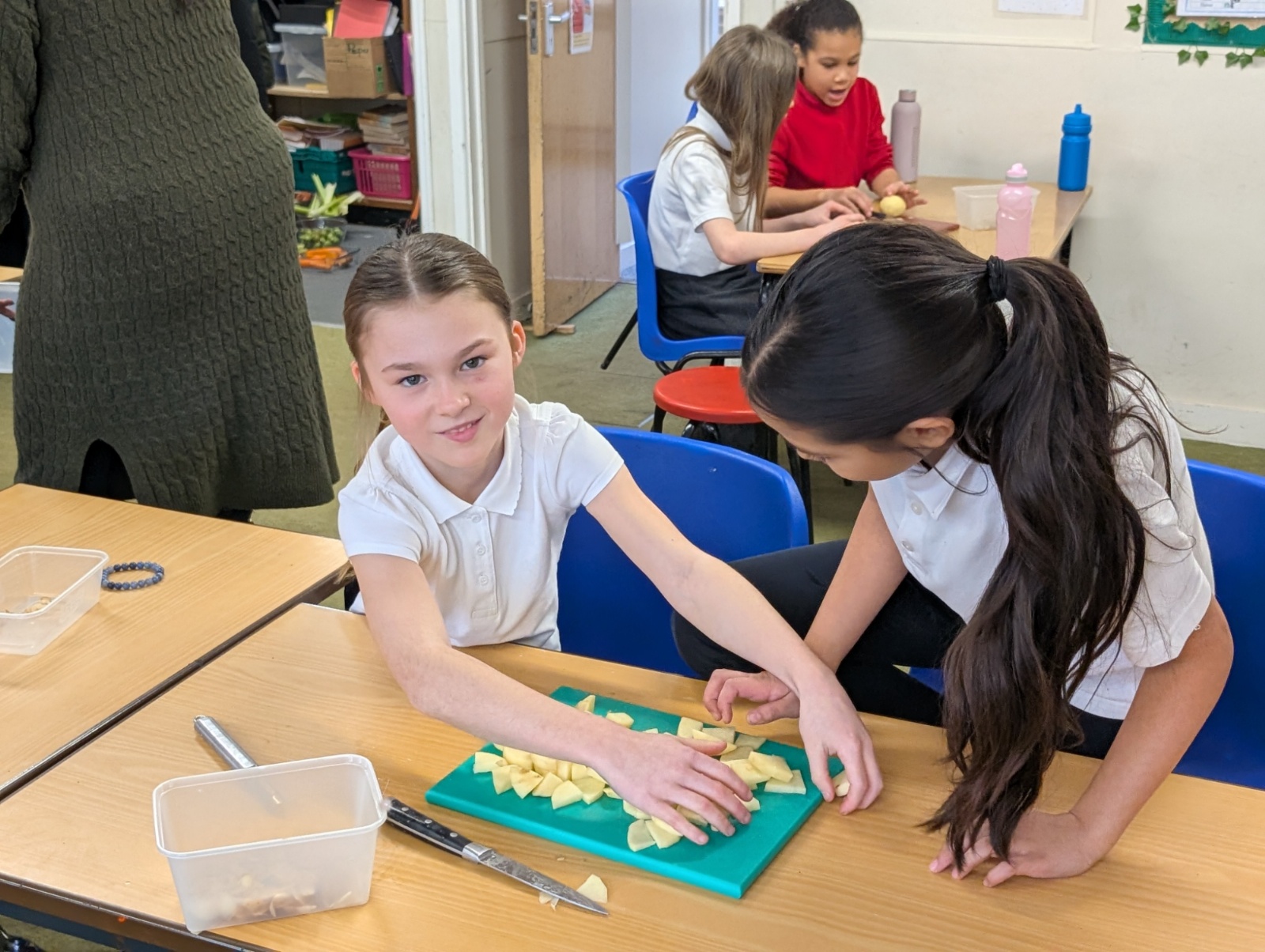 In DT, we practised our chopping skills in preparation for our upcoming World War II Cooking Day. We worked carefully with our partners to keep everyone safe, using the bridge, claw, and cross-chop positions correctly.