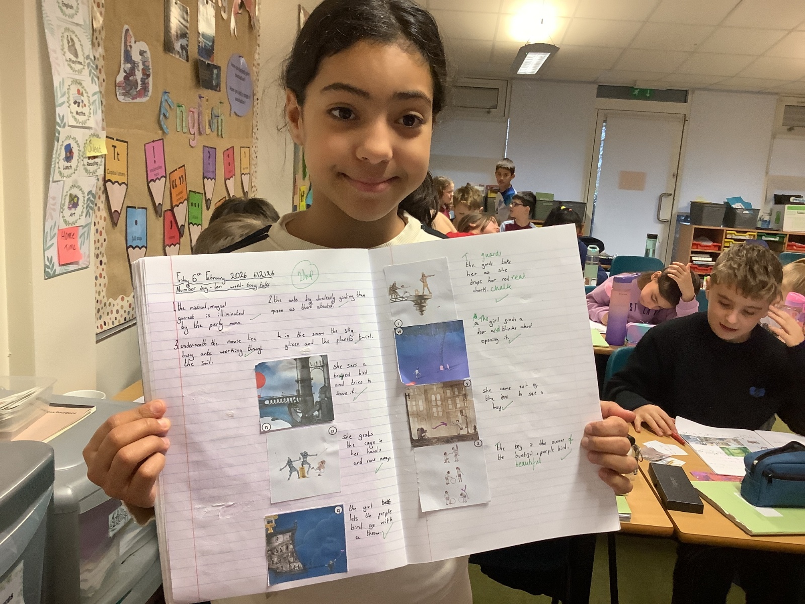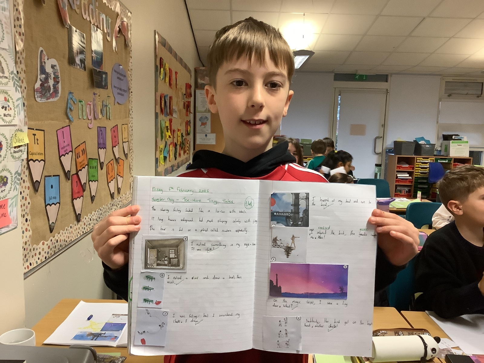 To highlight that maths is everywhere and part of everything we do, the children explored maths through English lessons too. They were inspired by Ten-Word Tiny Tales by Joseph Coelho and friends and practised writing their own 10-word stories. After that, we shared the beautiful wordless book Journey by Aaron Becker. Working in groups of four, the children wrote 10-word tiny tales to accompany the illustrations and created their very own mini-books.