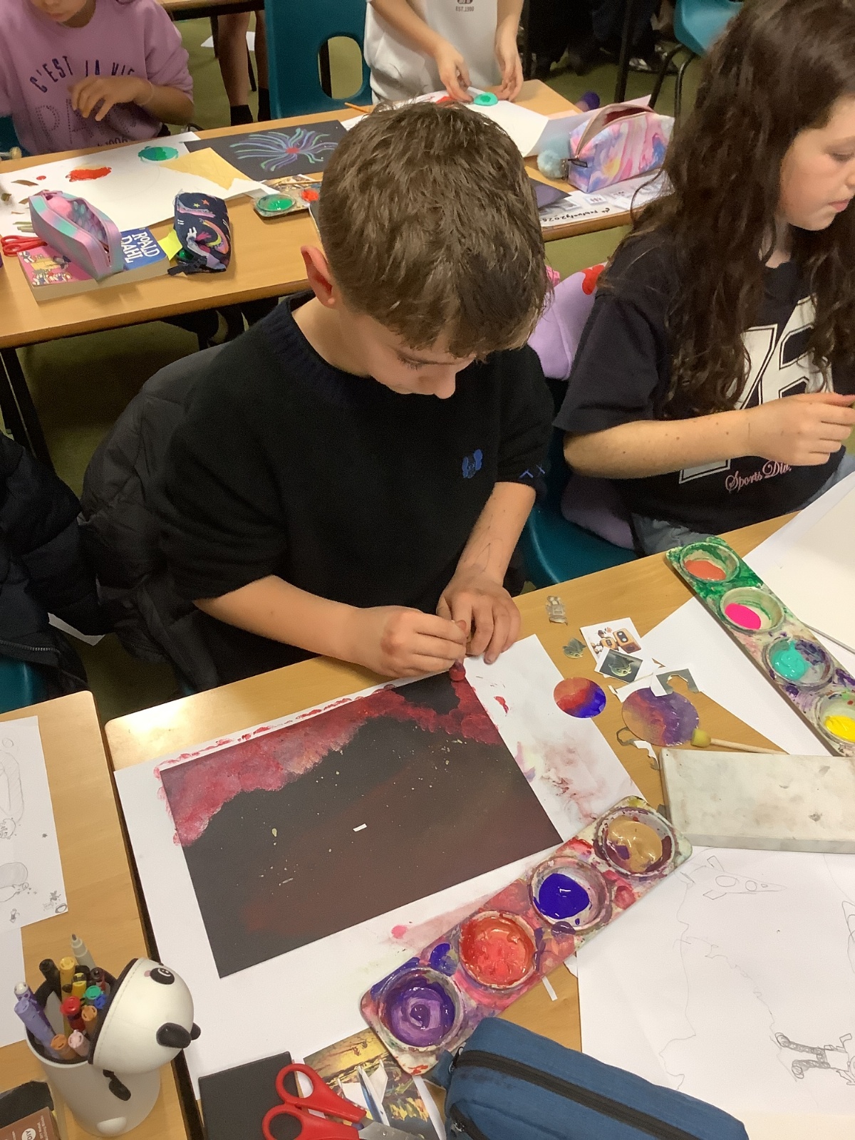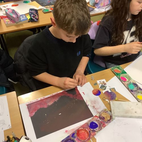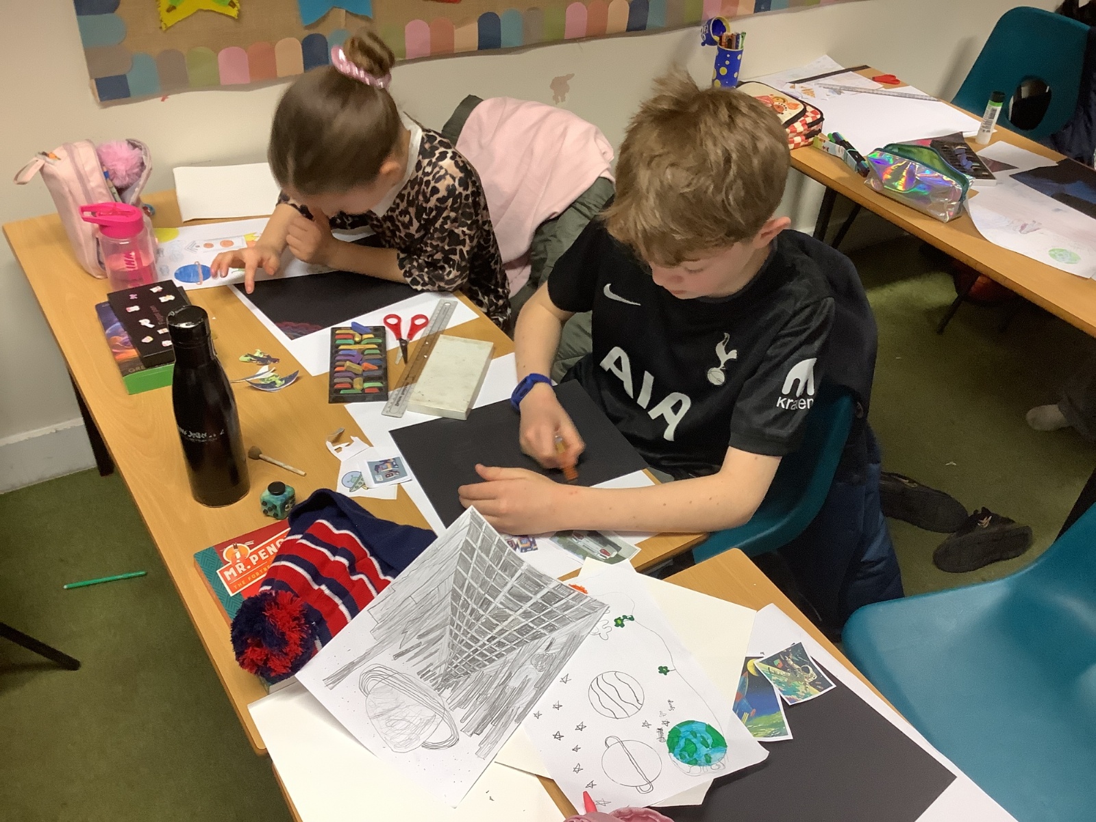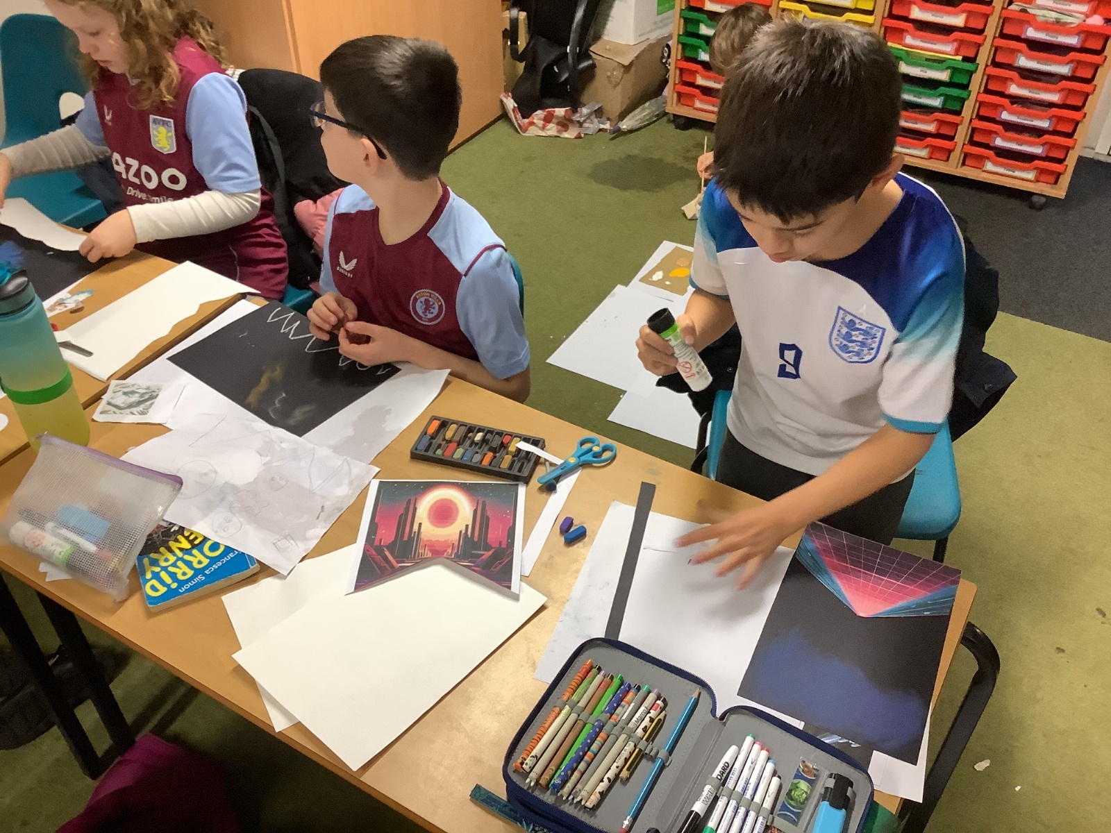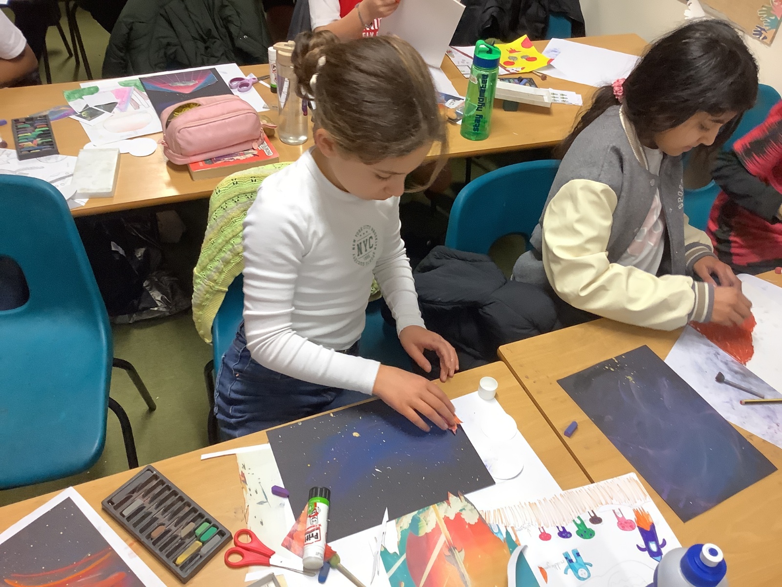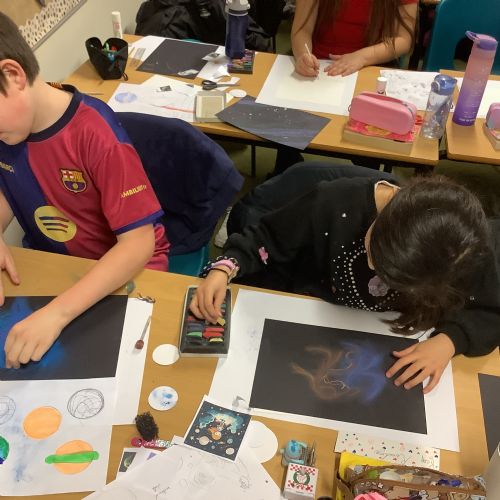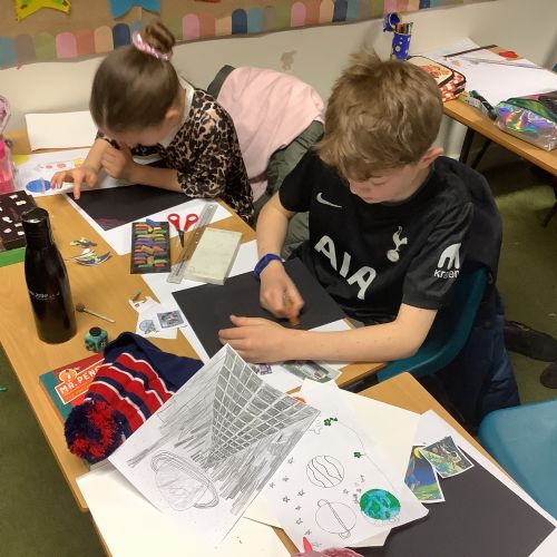 During Art, the children explored shape and completed their final retrofuturism collage pieces. Using a mix of soft chalk pastels, oil pastels, acrylic paint, and collage images, they carefully combined different media to create unique and striking artworks. The final pieces were imaginative, thoughtful, and full of personality.